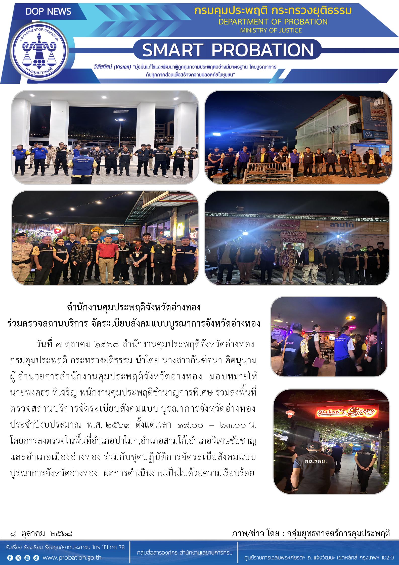 วันที่ ๗ ตุลาคม ๒๕๖๘ สำนักงานคุมประพฤติจังหวัดอ่างทอง กรมคุมประพฤติ กระทรวงยุติธรรม นำโดย นางสาวกันฑ์จนา คิดนุนาม ผู้อำนวยการสำนักงานคุมประพฤติจังหวัดอ่างทอง มอบหมายให้ นายพงศธร ทีเจริญ พนักงานคุมประพฤติชำนาญการพิเศษ ร่วมลงพื้นที่ตรวจสถานบริการจัดระเบียบสังคมแบบบูรณาการจังหวัดอ่างทอง ประจำปีงบประมาณ พ.ศ. ๒๕๖๙ ตั้งแต่เวลา ๑๙.๐๐ - ๒๓.๐๐ น. โดยการลงตรวจในพื้นที่อำเภอป่าโมก,อำเภอสามโก้,อำเภอวิเศษชัยชาญ และอำเภอเมืองอ่างทอง ร่วมกับชุดปฏิบัติการจัดระเบียสังคมแบบบูรณาการจังหวัดอ่างทอง ผลการดำเนินงานเป็นไปด้วยความเรียบร้อย
