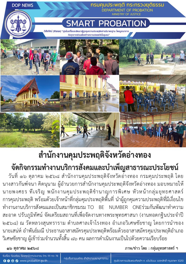 วันที่ ๑๖ ตุลาคม ๒๕๖๘ สำนักงานคุมประพฤติจังหวัดอ่างทอง กรมคุมประพฤติ โดยนางสาวกันฑ์จนา คิดนุนาม ผู้อำนวยการสำนักงานคุมประพฤติจังหวัดอ่างทอง มอบหมายให้ นายพงศธร ทีเจริญ พนักงานคุมประพฤติชำนาญการพิเศษ หัวหน้ากลุ่มยุทธศาสตร์การคุมประพฤติ พร้อมด้วยเจ้าหน้าที่กลุ่มคุมประพฤติพื้นที่ นำผู้ถูกคุมความประพฤติที่มีเงื่อนไขทำงานงานบริการสังคมและเป็นสมาชิกชมรม TO BE NUMBER ONE ร่วมกันพัฒนาทำความสะอาด ปรับภูมิทัศน์ จัดเตรียมสถานที่เพื่อจัดงานทางพระพุทธศาสนา (งานทอดกฐินประจำปี ๒๕๖๘) ณ วัดหลวงสุนทราราม ตำบลศาลเจ้าโรงทอง อำเภอวิเศษชัยชาญ โดยการนำของ นายเสน่ห์ อำพันธ์มณี ประธานอาสาสมัครคุมประพฤติพร้อมด้วยอาสาสมัครคุมประพฤติอำเภอวิเศษชัยชาญ ผู้เข้าร่วมจำนวนทั้งสิ้น ๘๖ คน ผลการดำเนินงานเป็นไปด้วยความเรียบร้อย